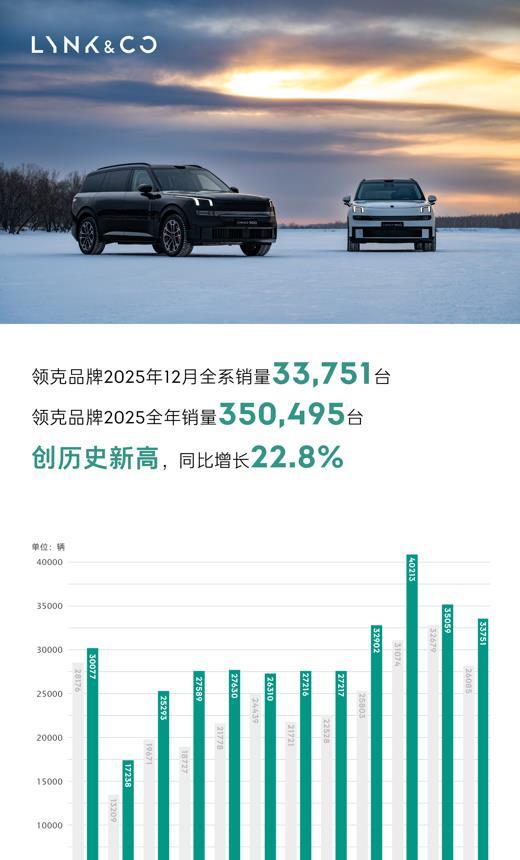 1月1日,领克对外公布在线配资查询,2025年12月销量为33751台,2025年全年累计销量达350495台,同比增长22.8%。自2017年首款车型投放以来,领克历史累计销量超过168万台,品牌市占率稳步提升,在充满挑战的市场环境中,展现出极强的发展韧性与增长潜力。